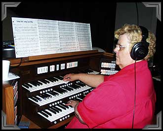 Deanna at the Roger's organ at Spanish River Church in Boca Raton, FL during the recording sessions for "Glorious Love".