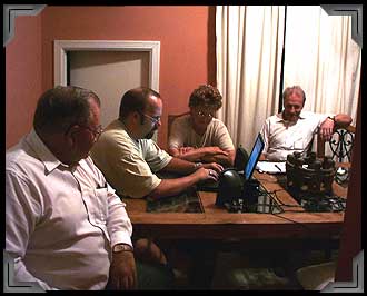 Earl (Doris's husband), Doris and Harold (Deanna's husband) look on as Bryan edits audio from the recording sessions.